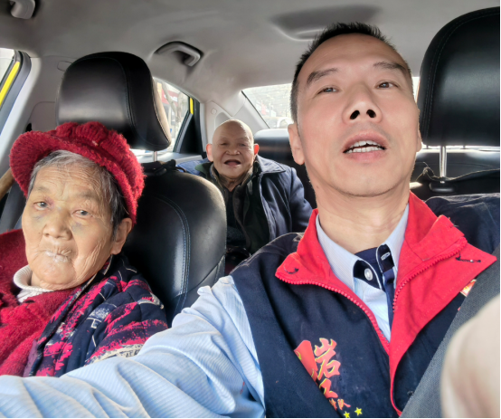 图为:美天东赢恒康联合党支部张奇林免费护送两位老人就医